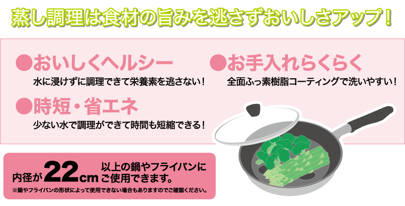 300ccの水を入れ沸騰後中火にしてから水がなくなるまで、 鍋22cmで約13分、フライパン24cmで約10分。 ※熱源の種類や気温、調理器具などによって時間が異なります。 ※空だきにならないようにお湯を補充してください。